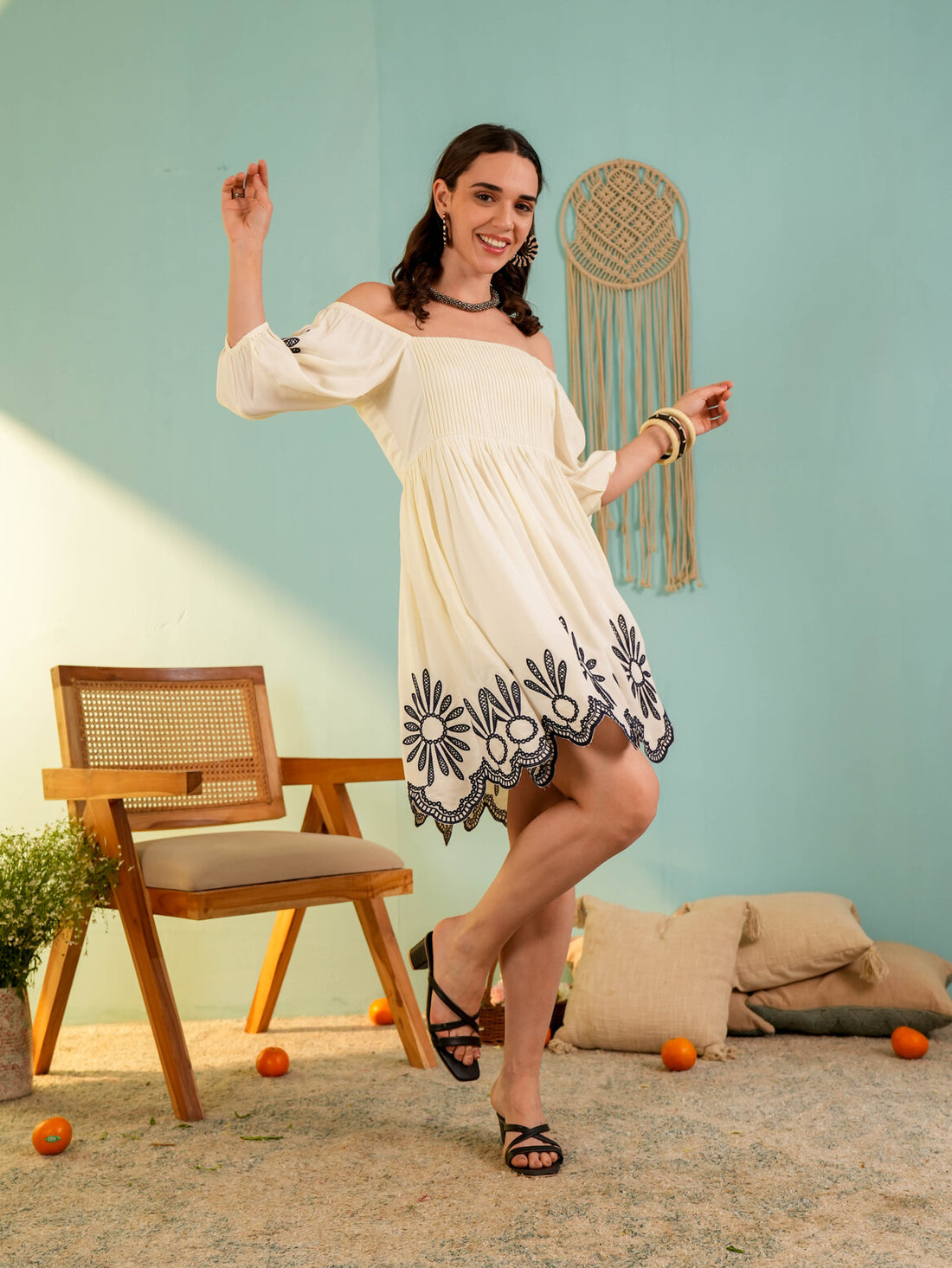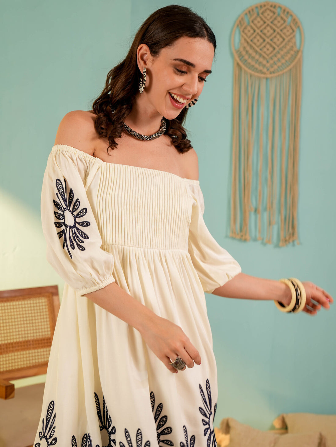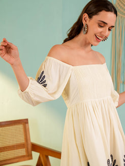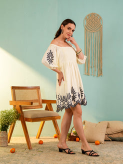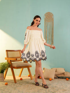 Beige Off-Shoulder Embroidery Mini Dress