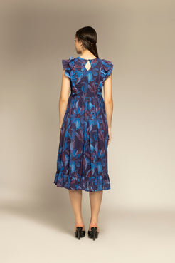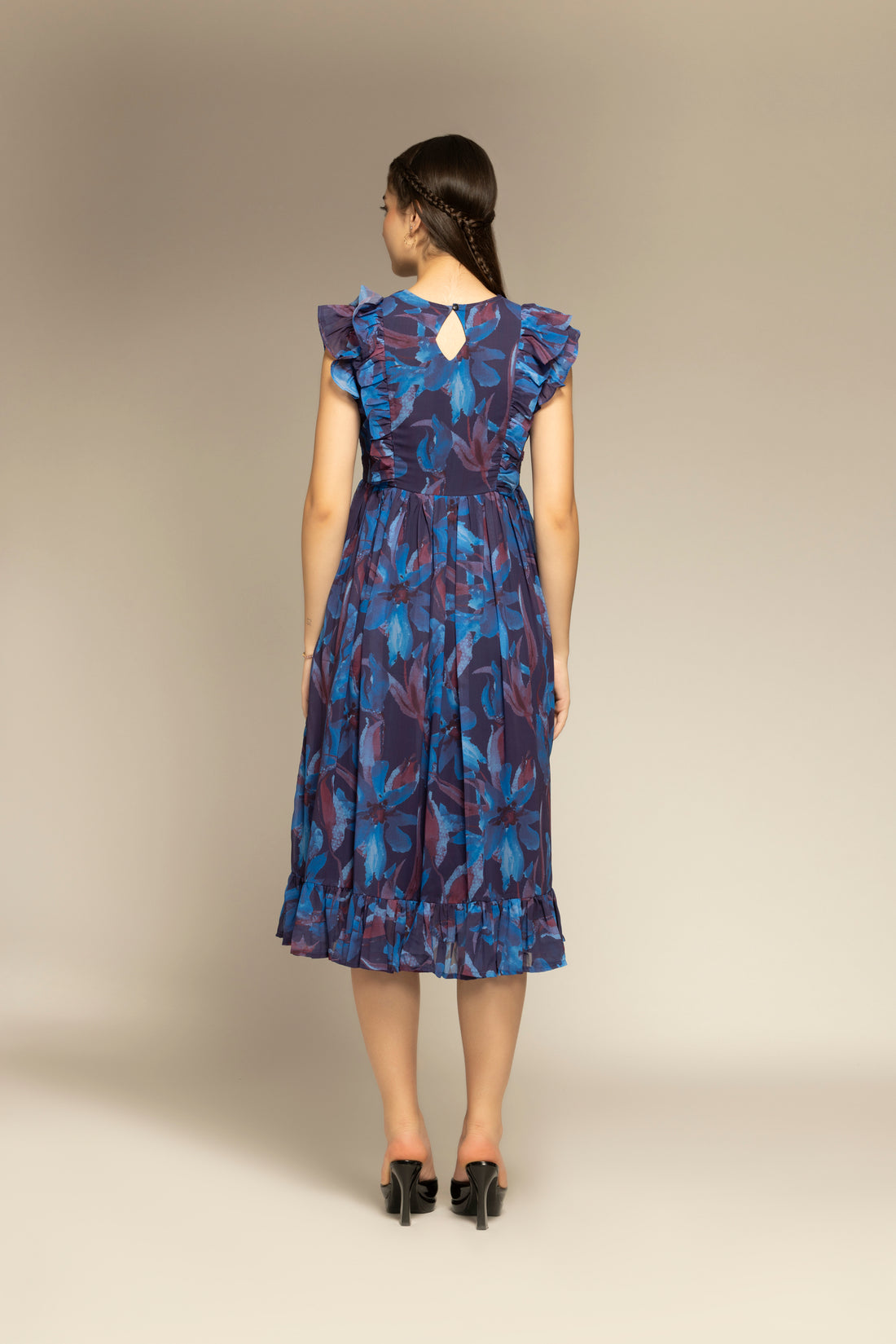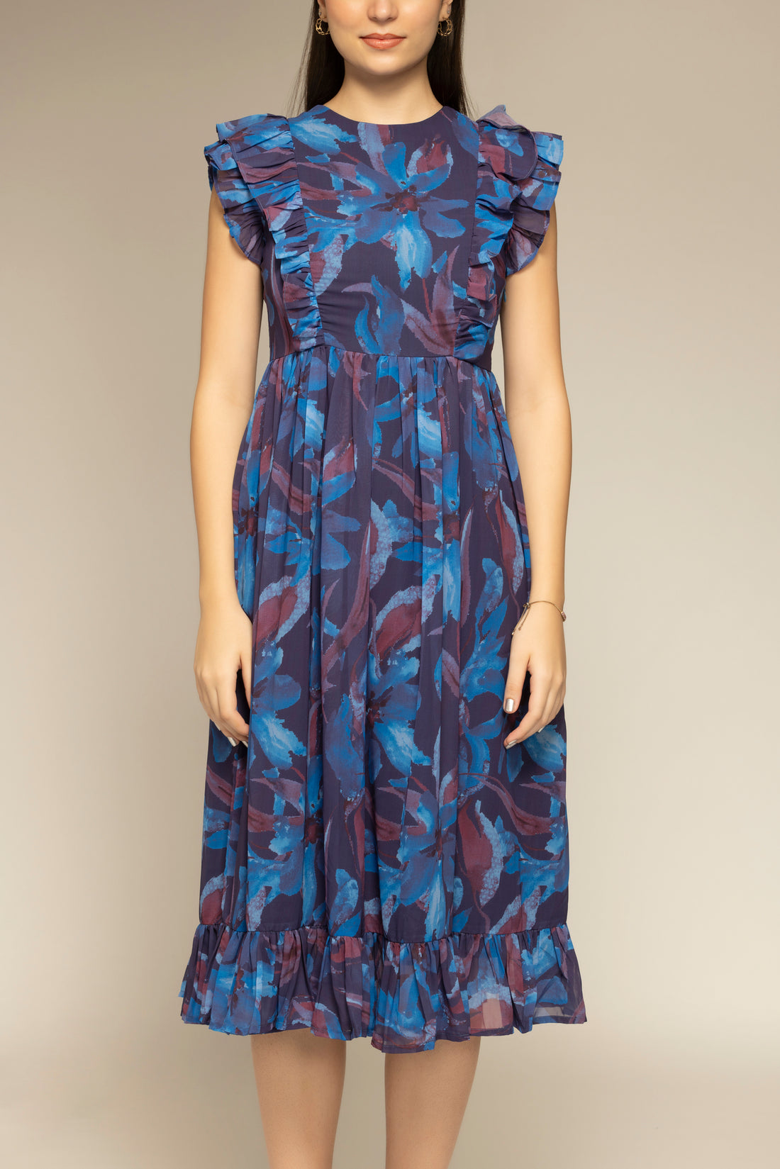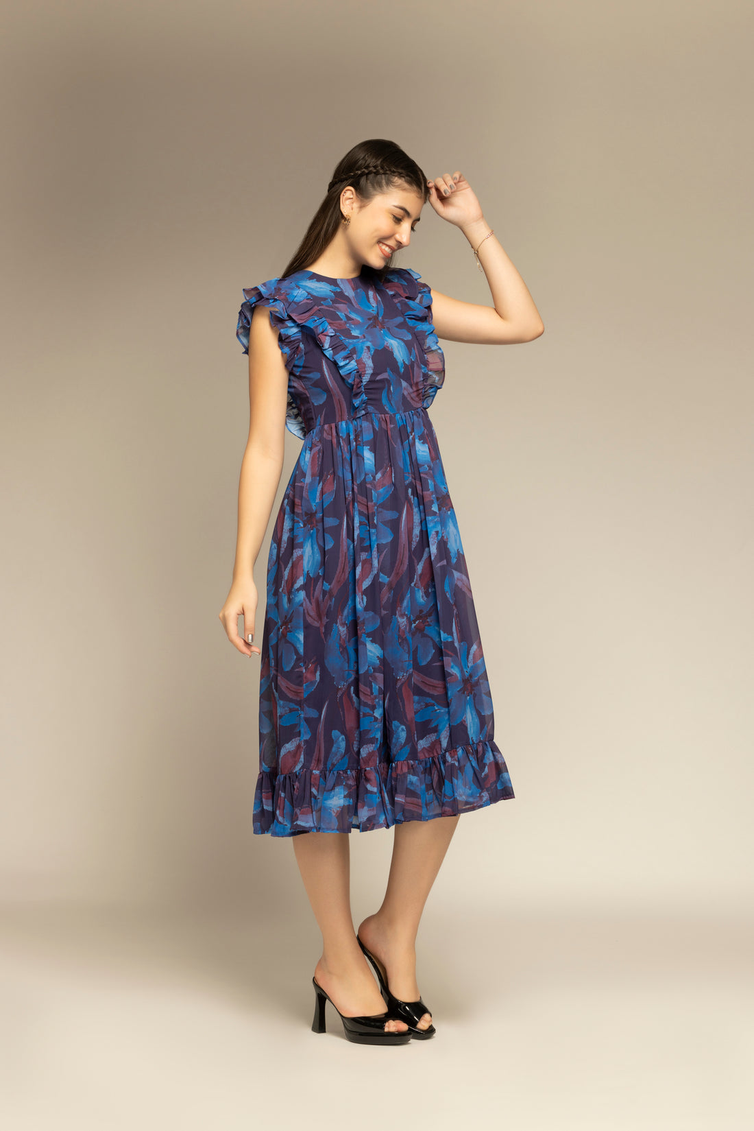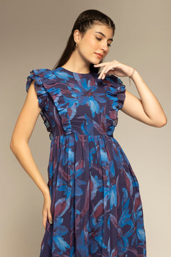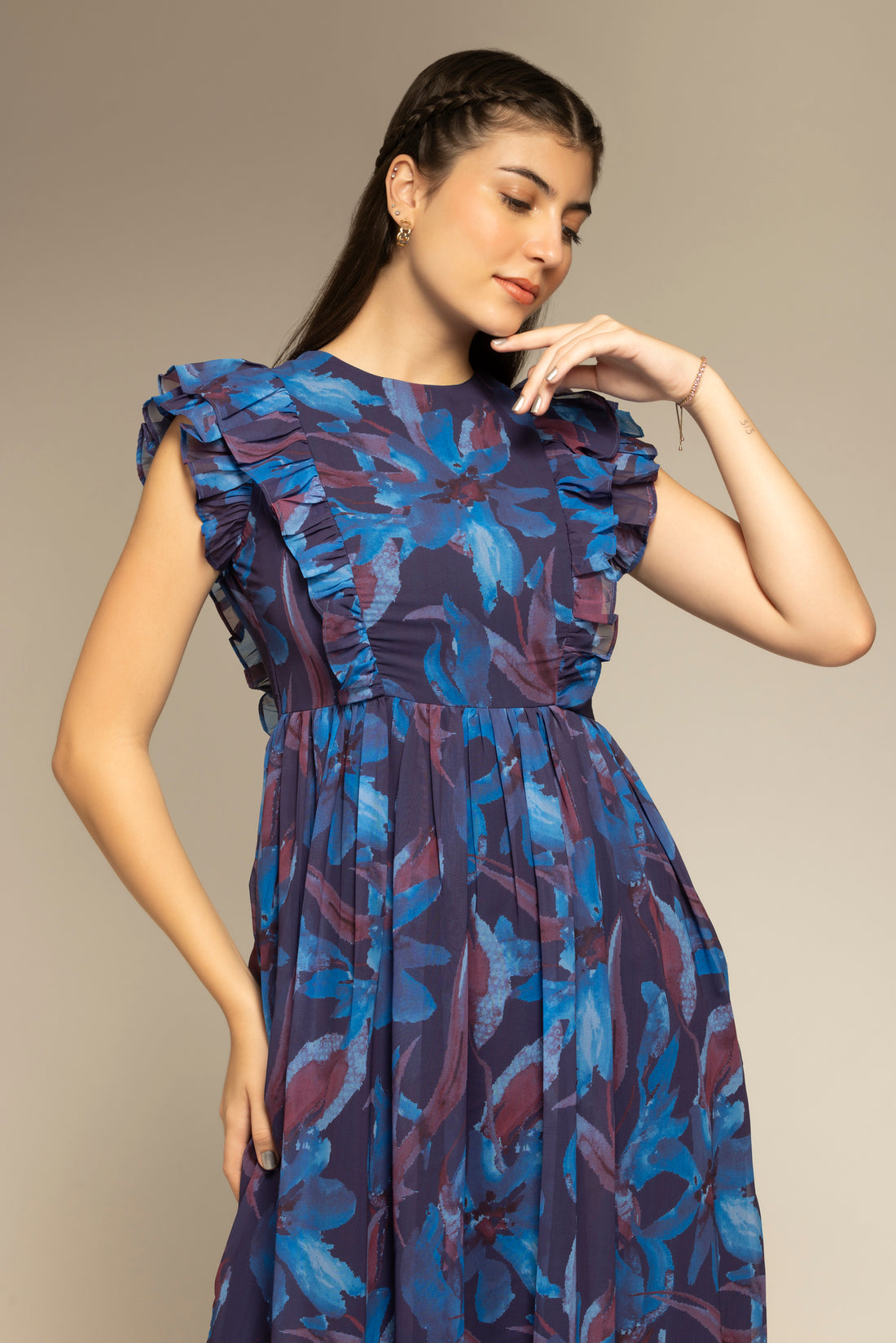 Blue Color Floral Printed Ruffle Sleeve Dress