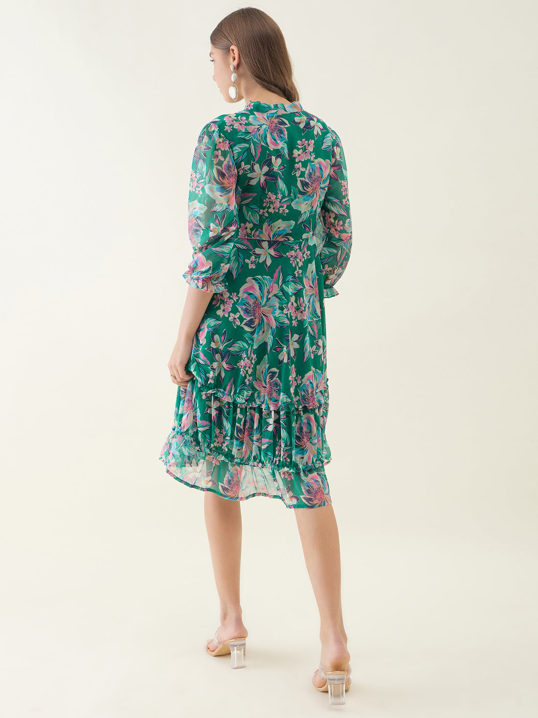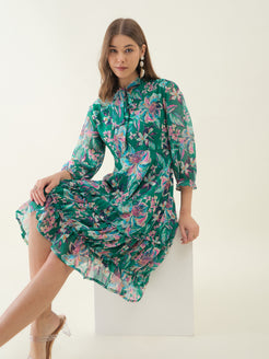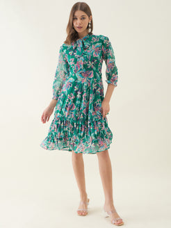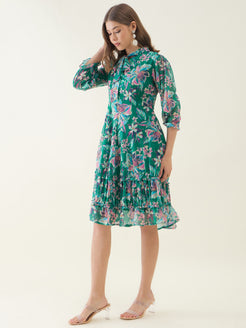 Green and Pink Floral Printed Fit & Flare Dress