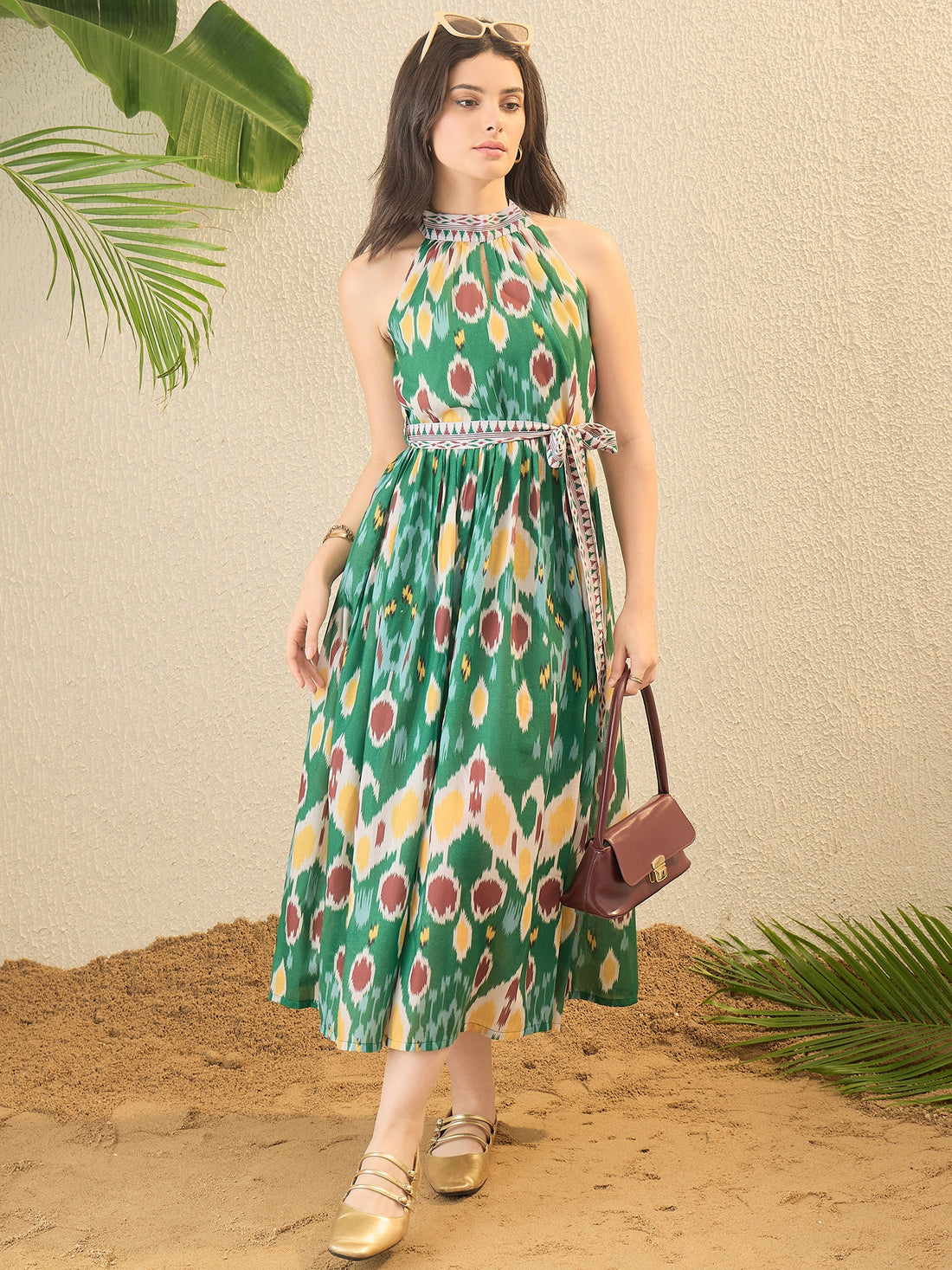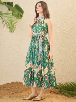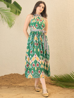 Green Ikat Printed Fit & Flare Dress