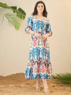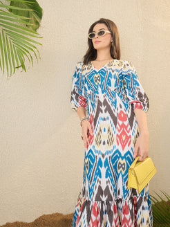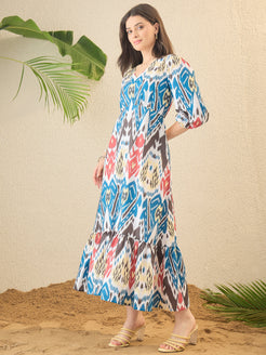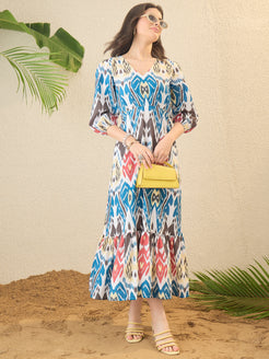 Multicoloured and Blue Ikat Printed Maxi Dress