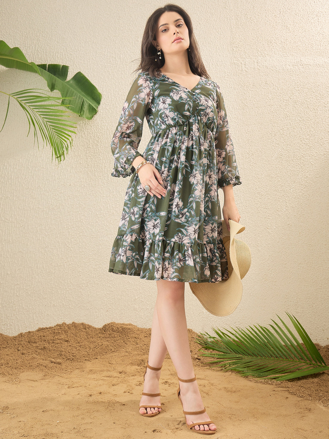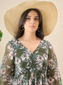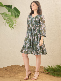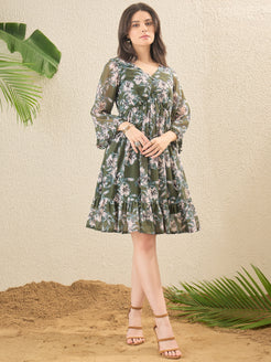 Olive Green and olive Green Floral print Fit & Flare Dress