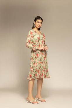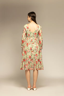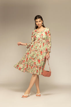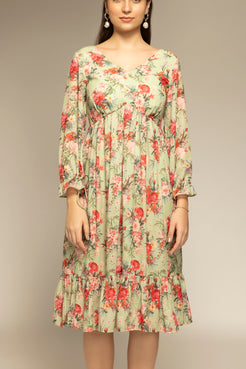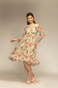 Parrot Green Floral Printed Flared Dress