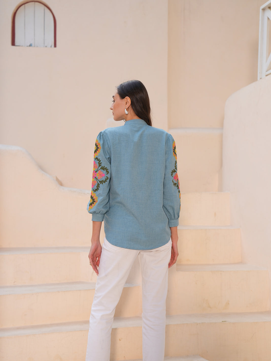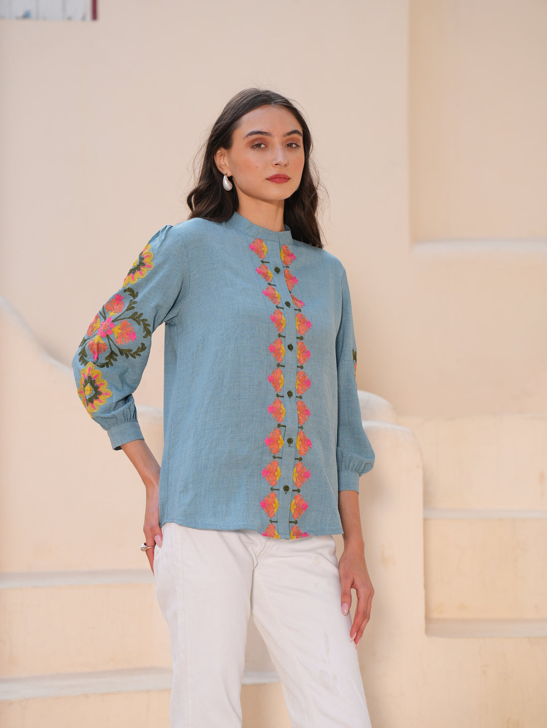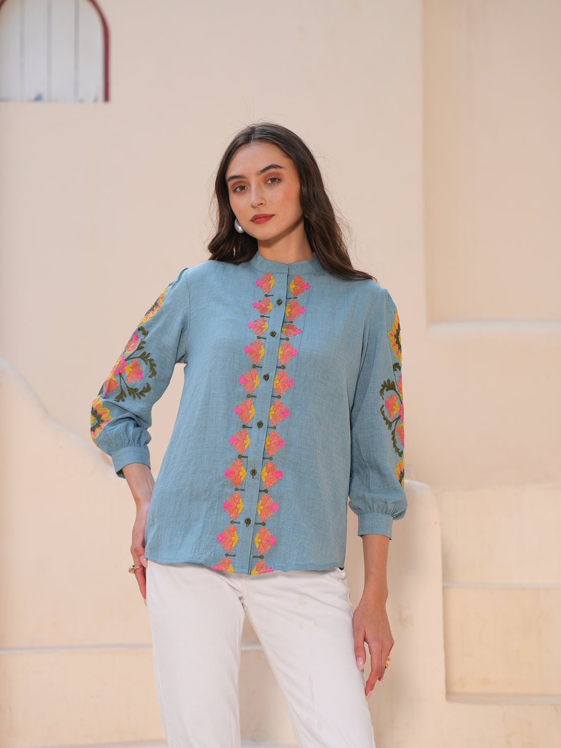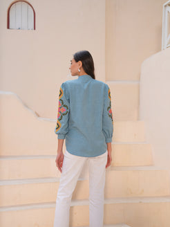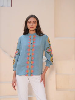 Powder Blue Embroidered shirt Style Top