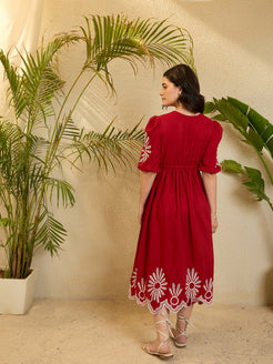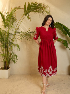 Red Enbroidery Puff Slevee Maxi Dress