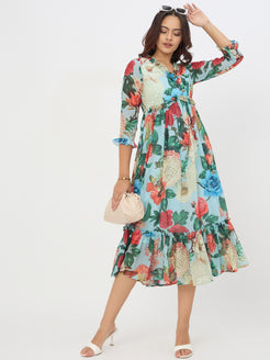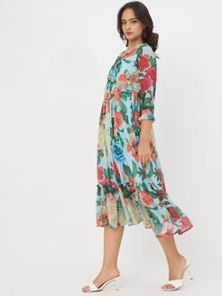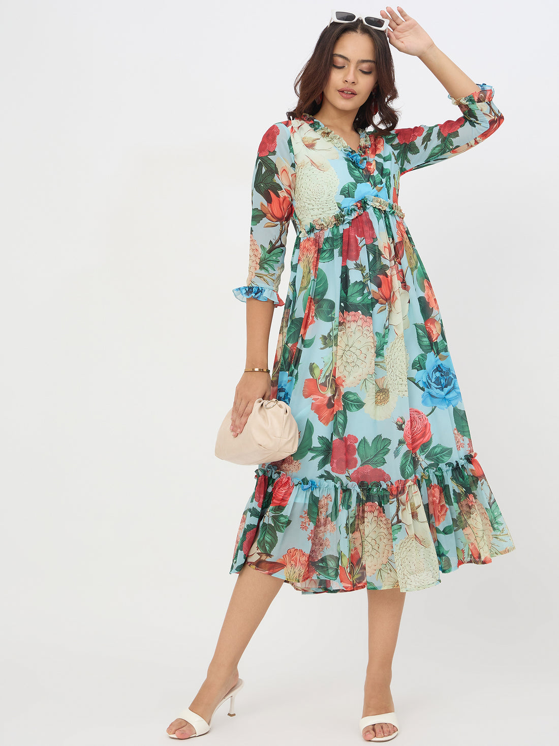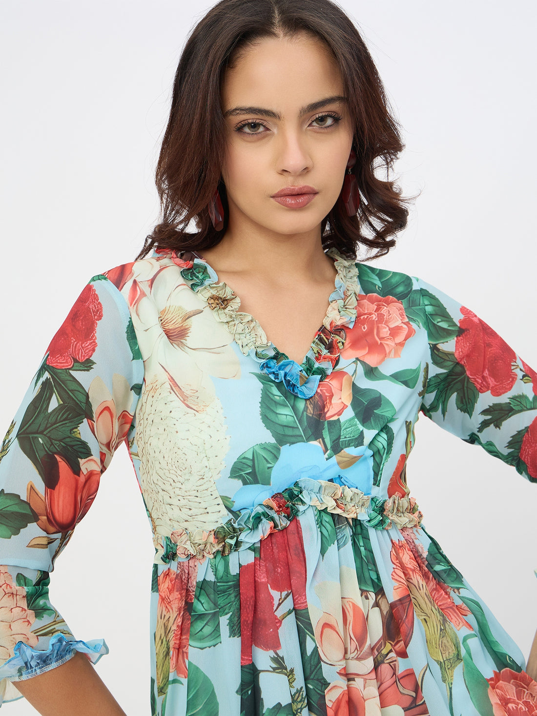 Sky Blue Floral Printed Frilled Maxi Flared Dress
