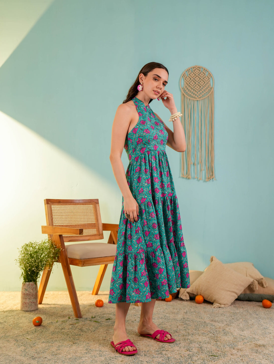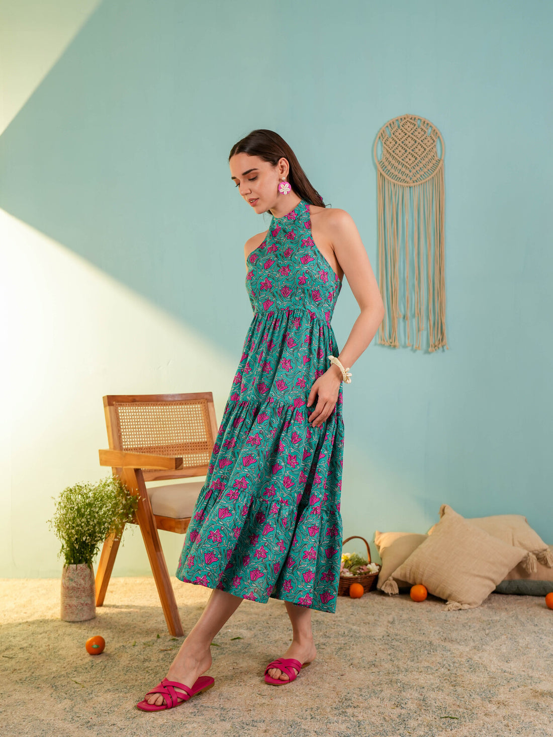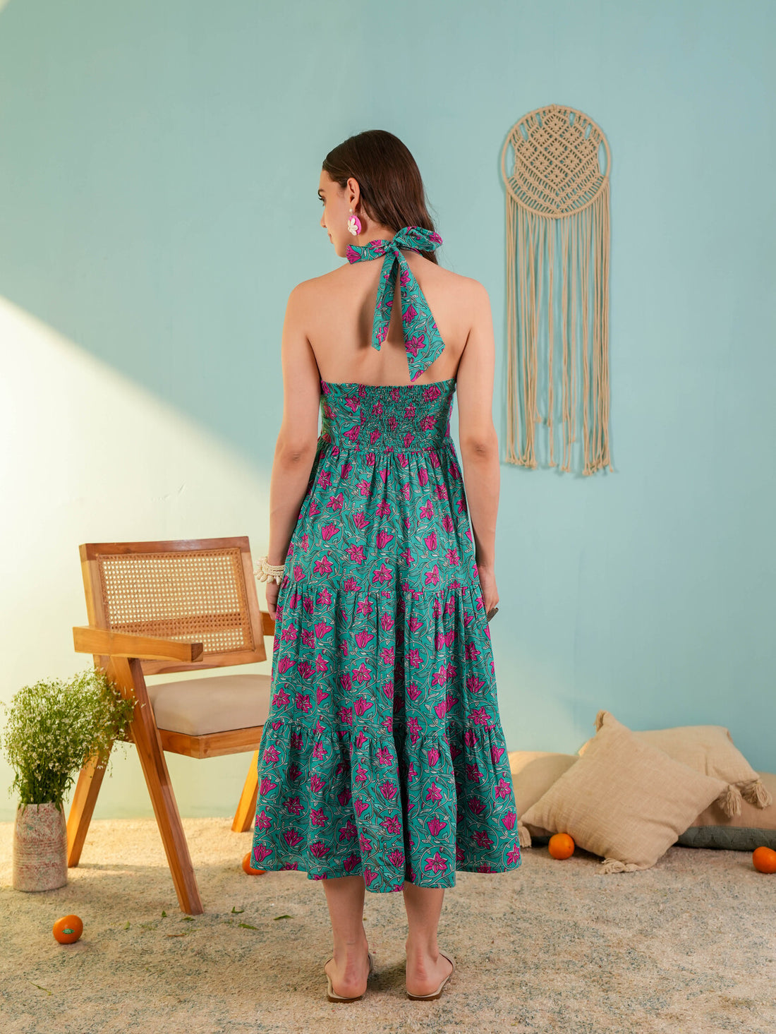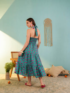 Teal Blue Floral Printed Gergette Midi Dress
