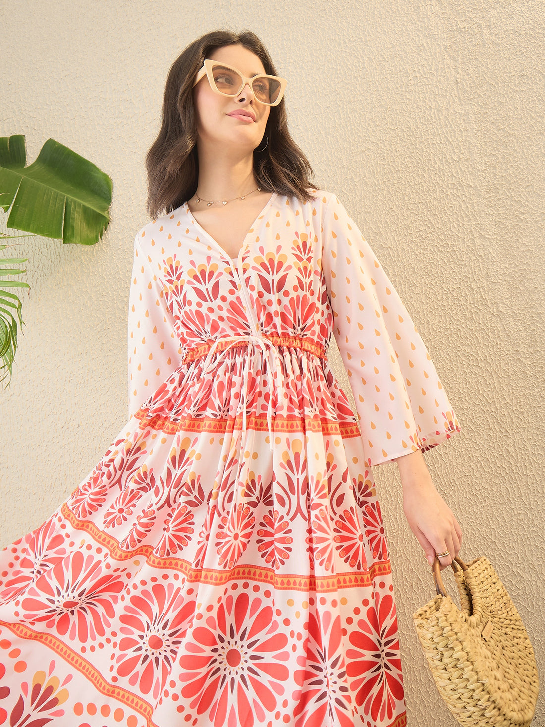 White Floral Print A-line Midi Dress