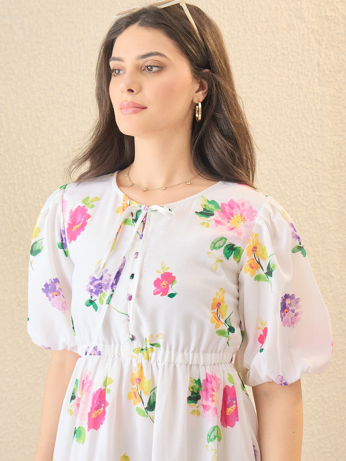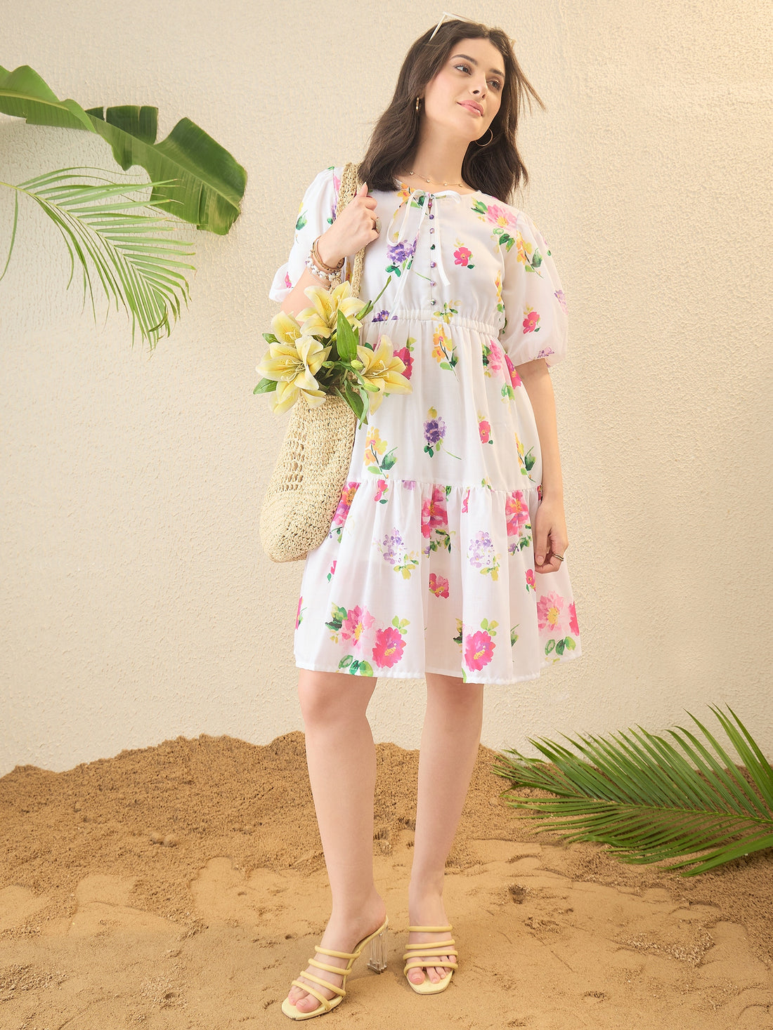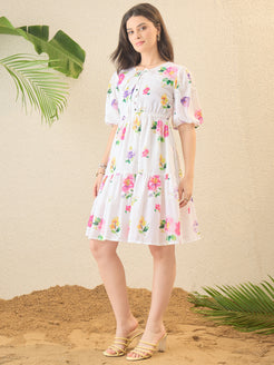 White Floral Printed Mini Flared Dress