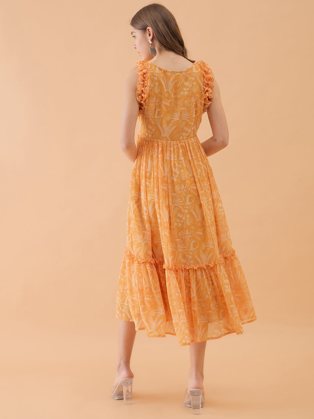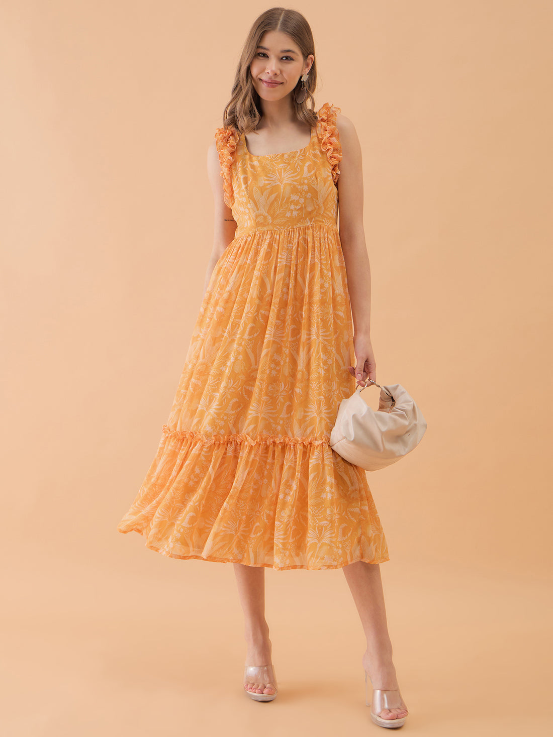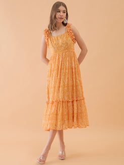 Yellow floral print Georgette Fit & Flare Midi Dress