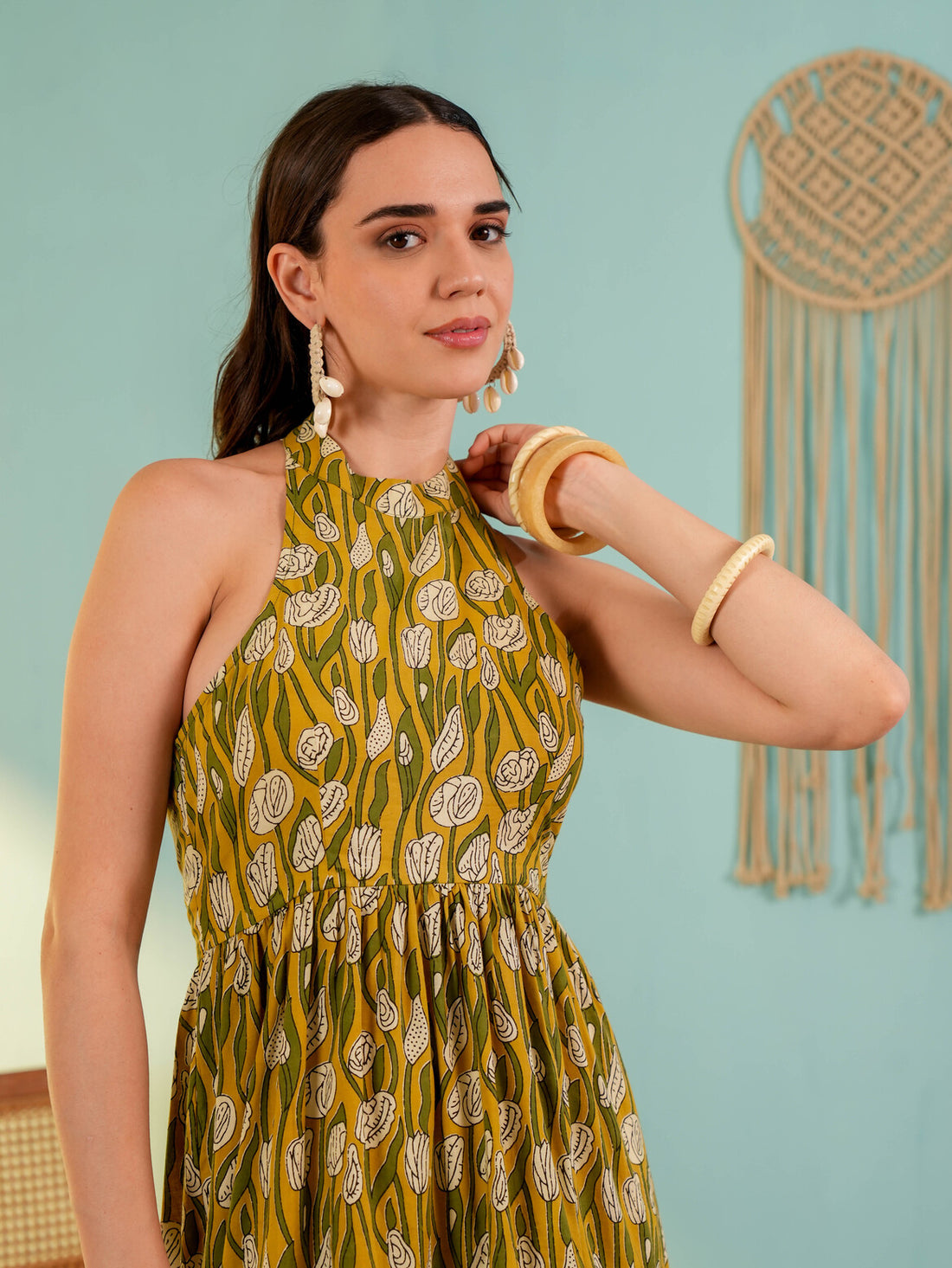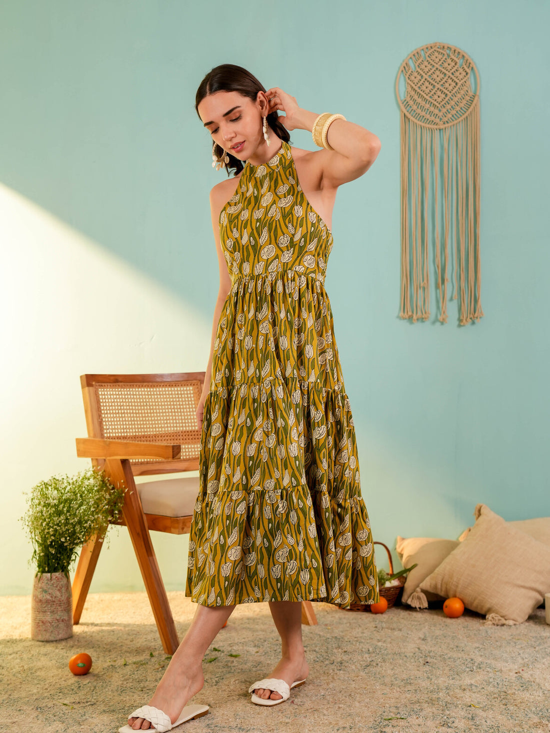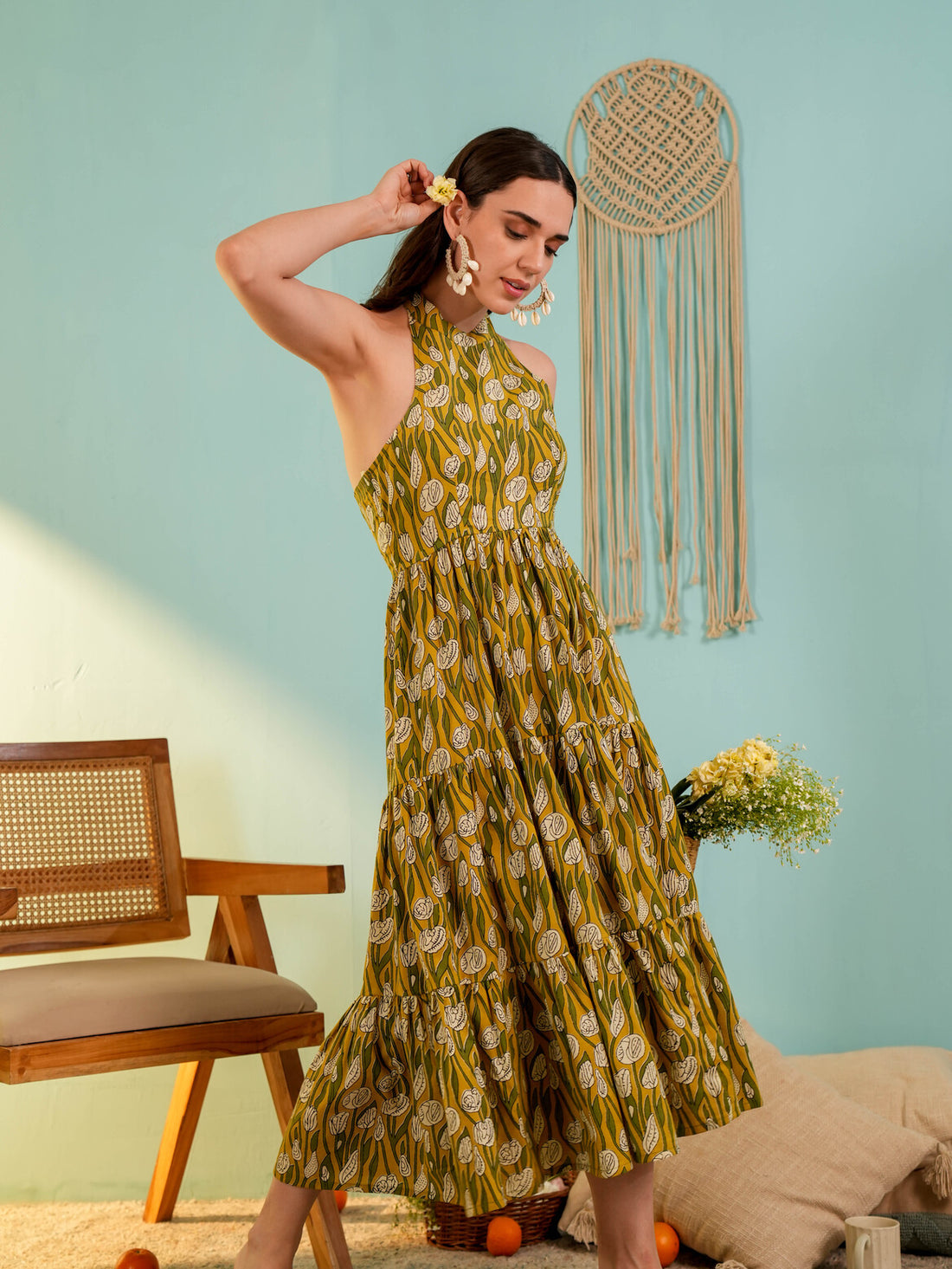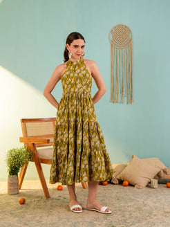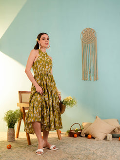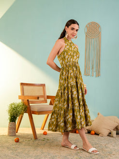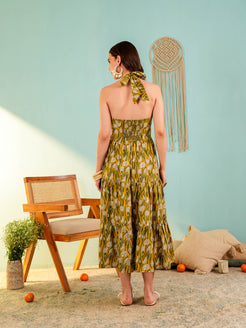 Yellow Floral Printed Fit & Flared Midi Dress