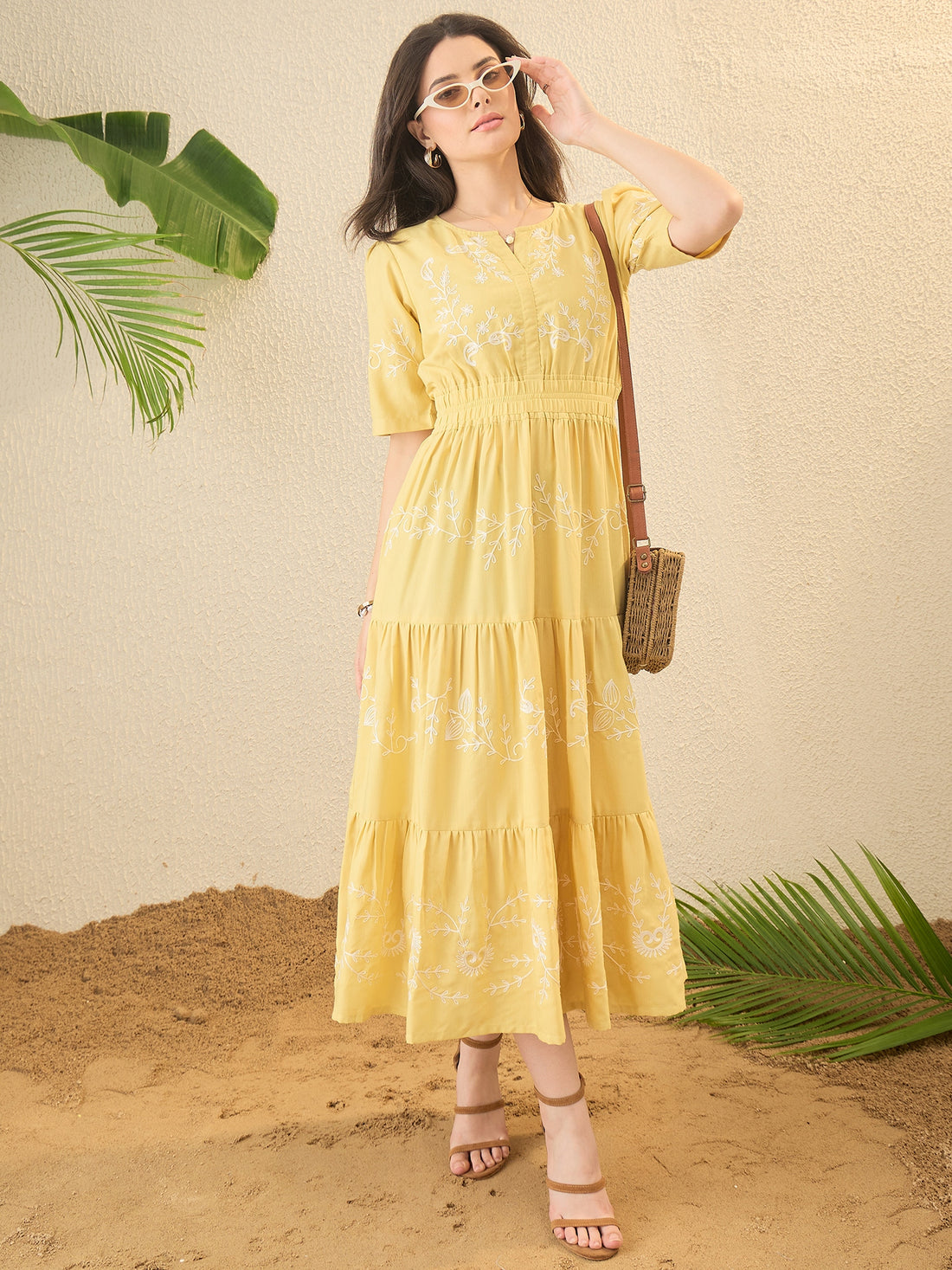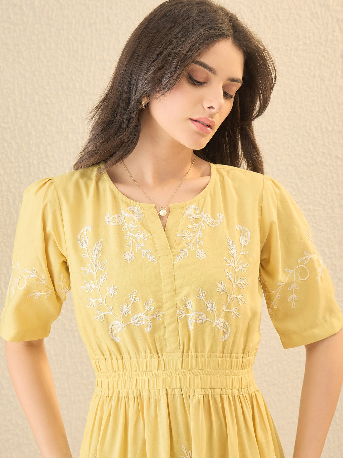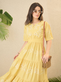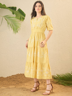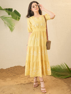 Yellow Self Design Embroidered Fit & Flare Dress